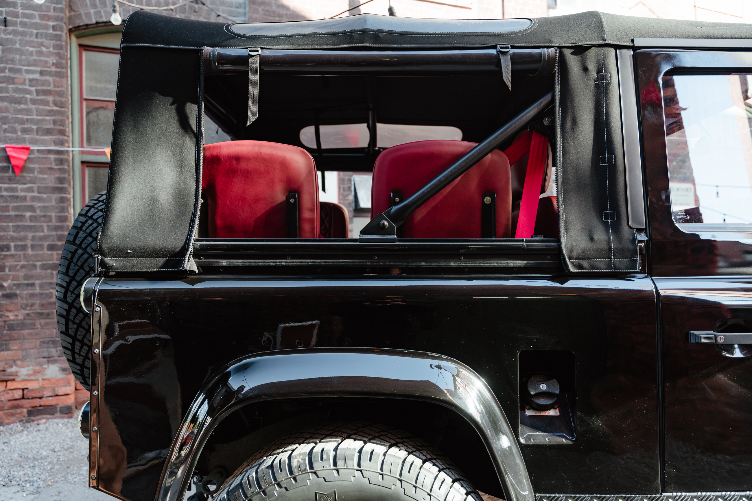 A fully restored Defender 90 in Beluga Black with Bentley Red leather interior - a modernized classic built from the frame up